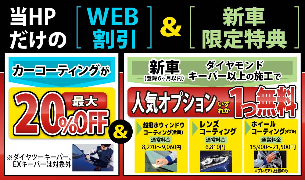 当HPをご覧になったお客様限定で、コーティングの施工料金20%割引を実施中!また、他社にはないお得な特典もお客様にご提供しております。キーパーコーティングをお考えのお客様は、是非、当店にお任せください!